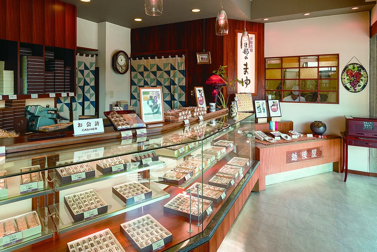 御菓子処越後屋 創業明治15年 スライド1懐かしくて、新鮮な食感『伊那のまゆ』スライド2越後屋でしか味わえない格別のお土産スライド3創業明治15年、伝統の味 御菓子処 越後屋 伊那のまゆ月夜唄お蔵米伊那讃菓 御菓子処越後屋 越後屋とはお店のご案内ご注文について 新着情報 abn長野朝日放送「駅テレマルシェ」で伊那のまゆが紹介されました2026-04-08abn長野朝日放送の情報番組 駅テレマルシェ にて…...営業日のお知らせ(4月~5月)2026-04-06当店は通常、祝日は曜日に関わらず営業しておりますが…...「BS朝日『高見沢俊彦の美味しい音楽 美しいメシ』で紹介されました2026-03-103月6日放送 BS朝日『高見沢俊彦の美味しい音楽 …... お知らせ一覧 メディア紹介 ba_online_1越後屋公式オンラインショップ一時休止中 ba_online_2越後屋公式オンラインショップ一時休止中 ba_online_3越後屋公式オンラインショップ一時休止中 販売状況などをinstagramでご覧いただけます 特別なお知らせ info 店舗に関するお知らせ info 伊那のまゆ」の転売品にご注意ください info 市営駐車場のご利用について