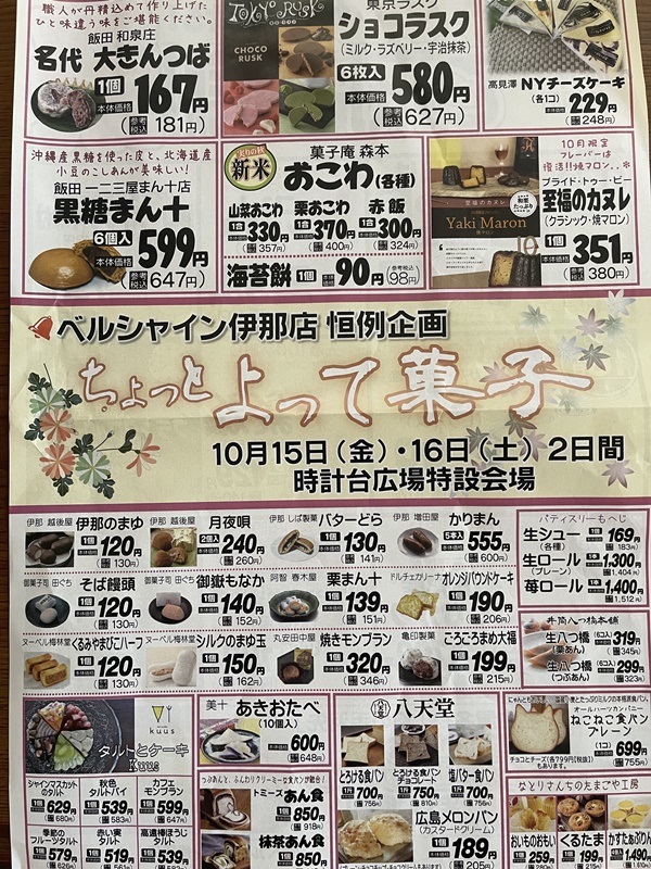 ベルシャイン伊那店にて「よって菓子」で販売 お知らせ 2021.10.16 「ベルシャイン伊那店」様にて2カ月に一度、15日・16日の2日間行われるイベント「よって菓子」が開催中です。 当店の「伊那のまゆ」「月夜唄」も販売いたしております。お買い物ついでにいかがでしょうか。 次回は12月15日・16日を予定しております。