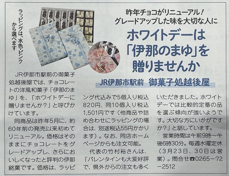 中日新聞ホームニュース伊那で紹介されました ニュース 2022.03.10 中日新聞ホームニュース伊那様で記事として弊店が紹介されました。 ギフト包装で「伊那のまゆ」「月夜唄」をホワイトデーにいかがでしょうか。