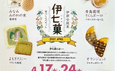 伊那地区7店舗の菓子店のお品の詰め合わせ「伊七菓」が4月17日、24日の2日間に分けて開催されます。「伊七菓」は、「伊那地方の色々なお菓子を一度に食べられる!」と毎回、大変好評を頂いております。当日各店で1100円(税込み)にて販売いたしま...