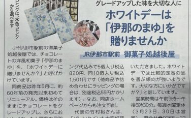 中日新聞ホームニュース伊那様で記事として弊店が紹介されました。ギフト包装で「伊那のまゆ」「月夜唄」をホワイトデーにいかがでしょうか。